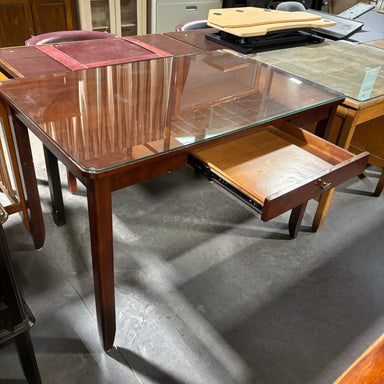 Description: Indon Reddish Brown Finish Solid Wood with Center Pullout & Glass Top DeskCondition: Slight Wear & Glass Scratches