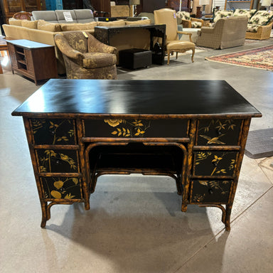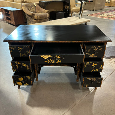 Description: Bamboo & Black Lacquer with Hand Painted Leaves & Birds 7 Drawer Chinoiserie DeskCondition: Great, Slight Wear