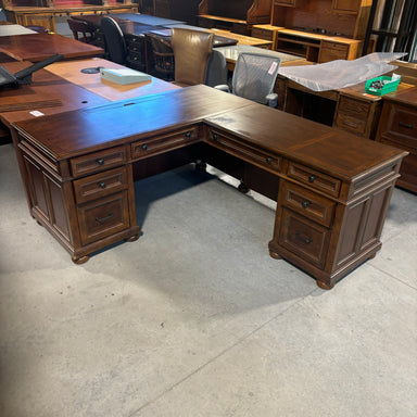 Description: Flexsteel Home Dark Finish Solid Wood 8 Drawer with Electrical Outlet Executive L-DeskCondition: Purposeful Distressing & Slight W...
