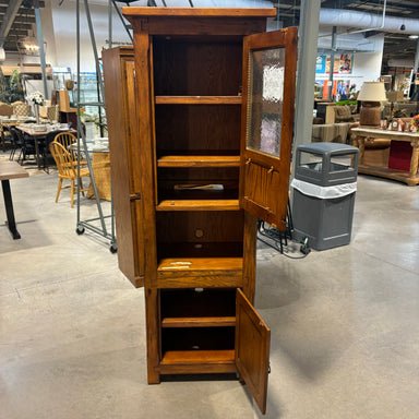 Description: Dark Finish Wood Rustic Style with 2 Wood & Glass Doors Display BookcaseCondition: Some Water Damage & Peeling on 2 Shelves