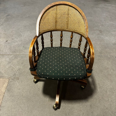 Description: Vintage Carved Wood & Caning with Seat Cushion on Casters Office ChairCondition: Slight Wear Consistent with Age