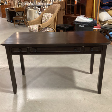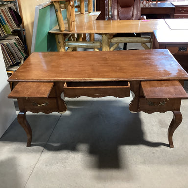 Description: Ornate Carved Dark Finish Wood 3 Drawer with Trestle Desk 66"x 32"x 30"Condition: Top Wear, Scratches & Marks