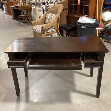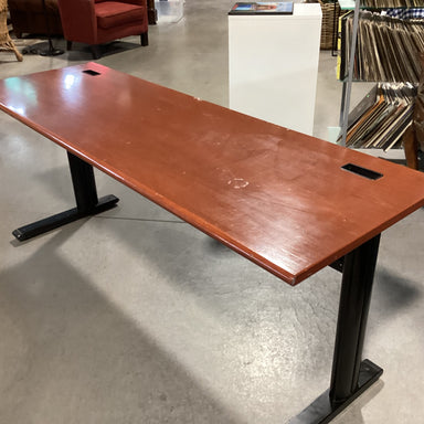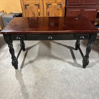 Description: Dark Cherry Finish Top with Solid Black Wood Base 2 Drawer & Center Pullout DeskCondition: Top Finish Wear