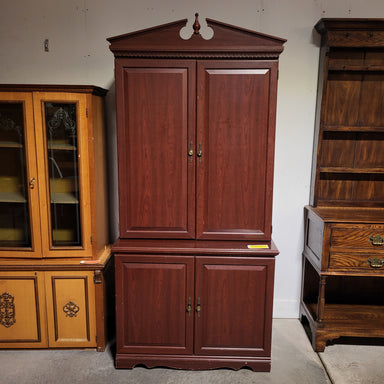 Description: Reddish Brown Wood Finish 2 Door Armoire Style Pullout DeskCondition: Some Wear & Scratches