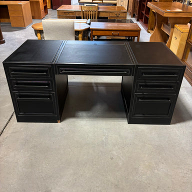Description: Arhaus Usine Black Finish Wood with Leather Top 6 Soft Close Drawers & Center Pullout Executive DeskCondition: Wood Chip on Bottom...