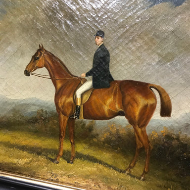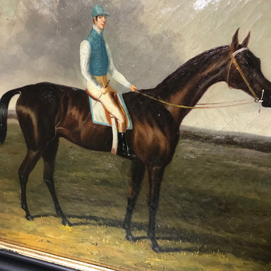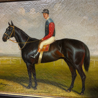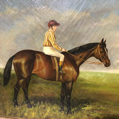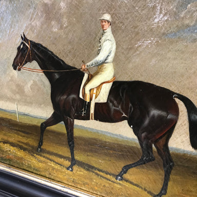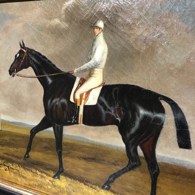 Description: Vintage Race Horse with Jockey Oil on Canvas Framed Condition: GreatDetails: Oil paint is crackling, wear consistent with the age. Cer...