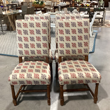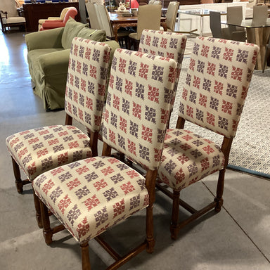 Description: Set Of 4 Carved Wood & Beige Purple Red Pattern Linen Dining ChairsCondition: Good, Few Stains