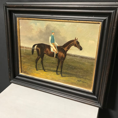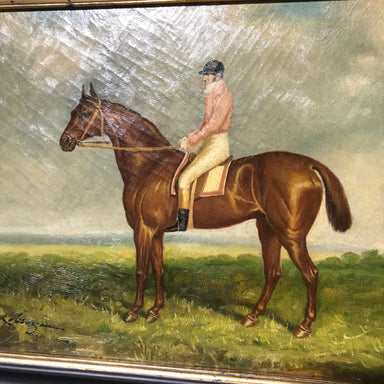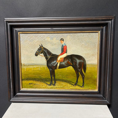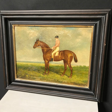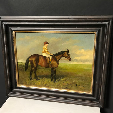 Description: Vintage Race Horse with Jockey Oil on Canvas Framed and Signed Wall Decor Condition: GreatDetails: Oil paint is crackling, wear consis...