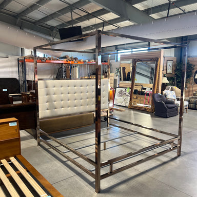 Description: KING Metal & Linen Canopy Bed SetCondition: Some Stains & Scratches