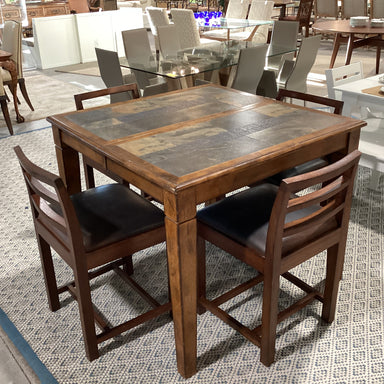 Description: Carved Wood & Slate Stone Tile with Center Butterfly Leaf Table with 4 Wood & Croc Style Faux Leather Barstools Dining SetCond...