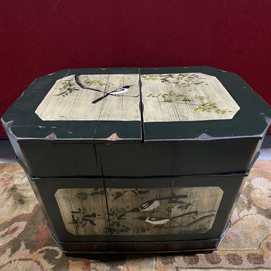 Description: Vintage Asian Handpainted Birds Calligraphy Lined Wedding Trunk with Handles,"25 x 15" x 17.25"Condition: GoodDetails: Left Side of Li...