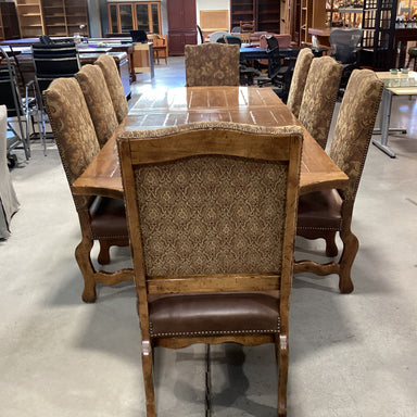 Description: Distressed Finished Wood with Leaf & 8 Carved Wood Leather & Upholstery Chairs Dining SetCondition: Good, Slight Wear & Fe...