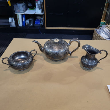 Description: Set of 3 Pcs. Antique British Silverplated Etched Clovers Tea SetCondition: Good