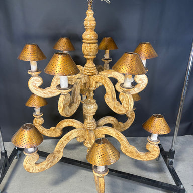 Description: Bruce Eicher 12-Light Tiered French Country Distressed Cream/Gold Wooden with Copper Shades ChandelierCondition: GoodDetails: Candle w...