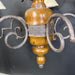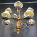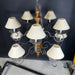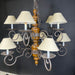 Description: Vintage Romantic Tiered 10-Light Medium Finish Wood and Bronze Metal Arms with Shades Chandelier