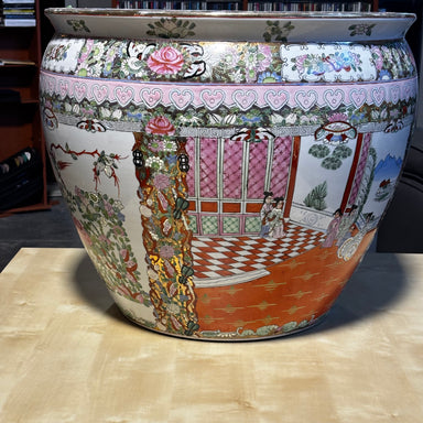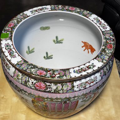Description: Large Vintage Chinese Qianlong Porcelain Fish Bowl Planter, 20" x 17"Condition: Good