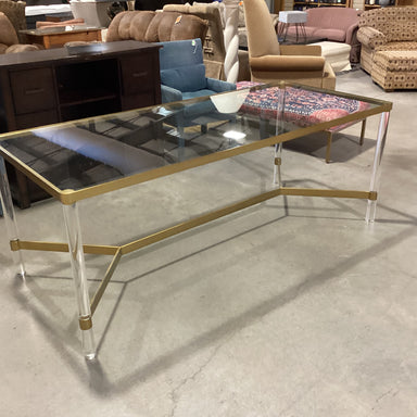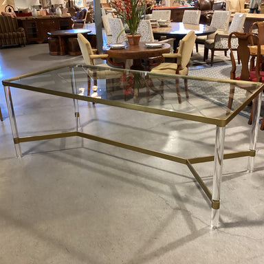 Description: Anthropologie Oscarine Lucite & Glass with Brass Finished Metal Console Sofa TableCondition: Slight Wear & Glass Scratches