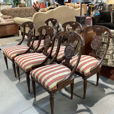 Description: SET of 6 Ornate Carved Wood & Gold Red Cherry Ribbon Dining ChairsCondition: Some Wear, Fading & Scratches