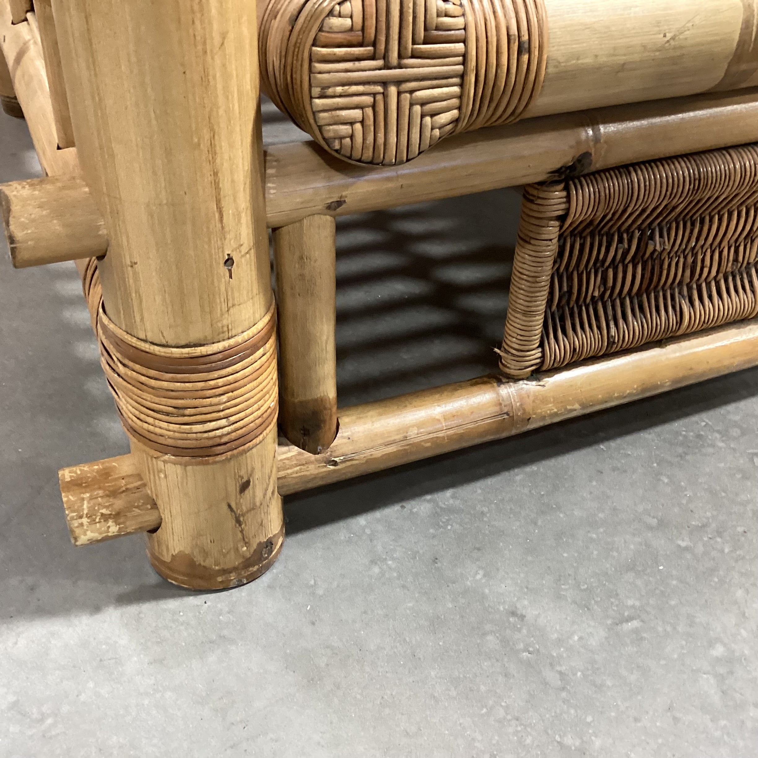 Description: Vintage Oversized Bamboo & Rattan Wicker with Palm Tree Cushions Pagoda Lounge Chair